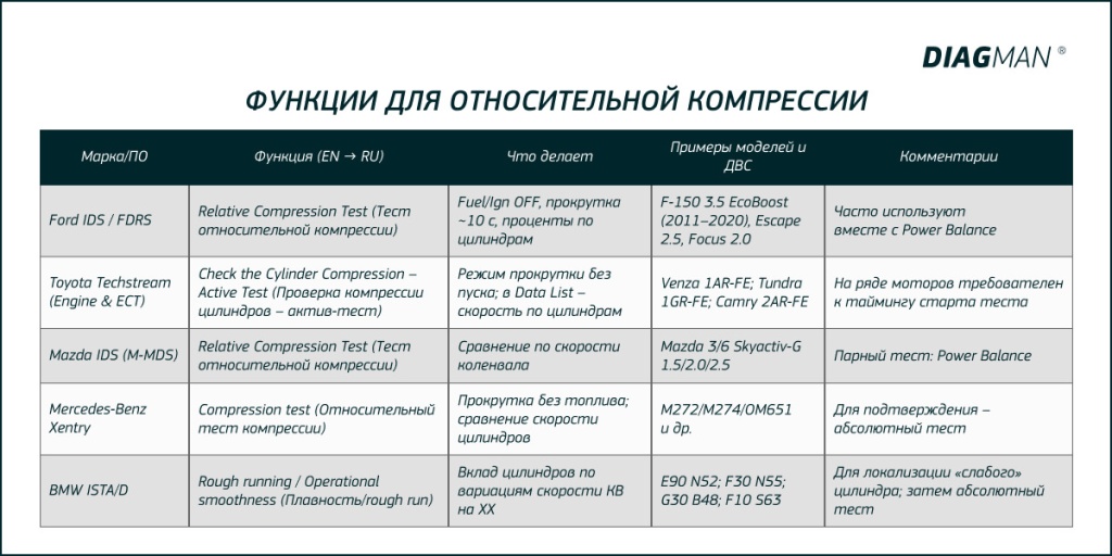 В этих условиях профессиональная диагностика требует комбинированного подхода — сочетания традиционных методов измерения абсолютной компрессии с современными возможностями относительного анализа через автосканеры.
